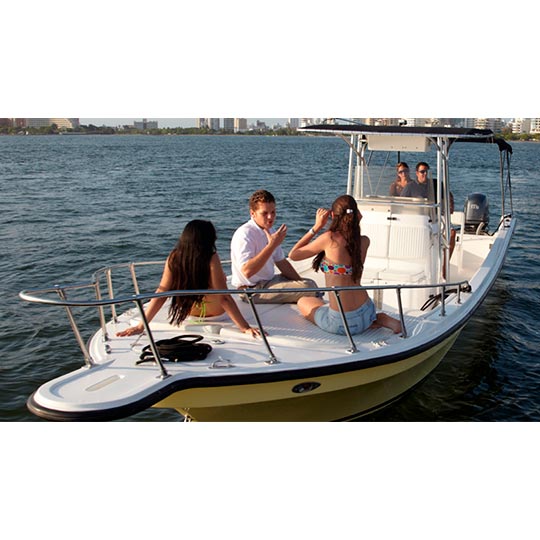 La configuración interior posee piso plano, un espacio para pesca abierto en popa con un asiento de espaldar abatible y dos bancas laterales hacia proa, así como una zona social en popa. Detalles que hacen del Barracuda toda una experiencia náutica con 4 portacañas cromadas, cómoda banca para 2 personas en la zona de consola y capacidad para 13 pasajeros. Sus 32 pies y diseño de casco en V modificada le permiten contar con la potencia de 2 motores de hasta 200 hp.